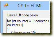 C# to HTML v1.0 绿色版 C# to HTML 是一款简单方便的工具,可以将 C# 代码集成在 HTML 页面上。C# 为 HTML 分析代码,自动生成的样式表,使您可以将它保存到您的计算机。此外,您可以将代码复制到剪贴板中。输出的是颜色编码,它更易于阅读,并且符合 HTML 标准。