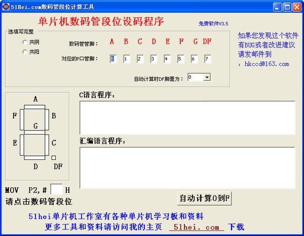 数码管段位计算工具 V3.5绿色版下载 数码管段位计算工具可以数码管管教所对应的单片机的io口的管脚,支持用鼠标点击手工输入段的数据,支持共阴和共阳2种数码管。并能同时生产汇编语言和单片机c语言2种代码可供选择.生产的源代码可直接应用在您的程序里面为您节约大量的计算时间。