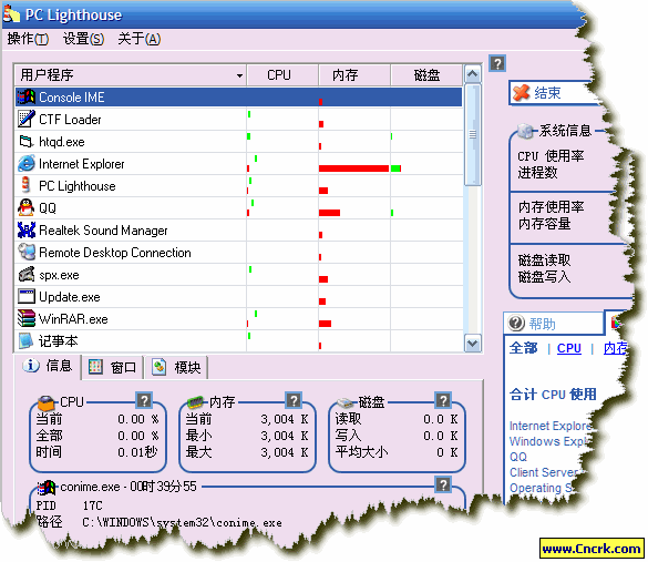 PC Lighthouse 是一个功能强大的任务管理器, 压缩后仅有87Kb, 它可以轻松地结束正在运行的程序, 并查看当前程序使用的组件等详细信息, 高亮的图形可以清楚地反映内存、CPU 的使用状况, 它还可以随系统启动, 就在今天换掉单一的任务管理器吧.