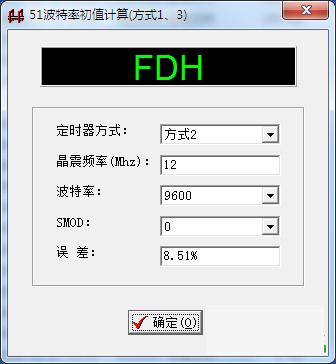 51单片机波特率设置初值计算工具,用于51单片机片内UART异步串行通信各种定时器方式下波特率的设置。 使用方法:选择定时器方式,晶振频率,波特率和SMOD计算波特率初值以及显示出此值与实际的误差