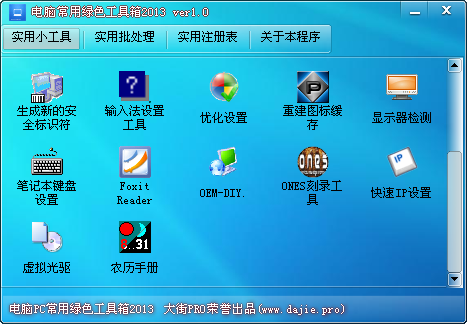 1.小工具:定时关机、磁盘碎片整理、AIDA64、CPUZ、内存测试、硬盘检测、垃圾清理、u盘病毒免疫器、分辨率设置、快速建立ADSL连接、生成新的安全标示符、输入法设置工具、优化设置、重建图标缓存、显示器检测、笔记本键盘设置、Foxit Reader、OEM-DIY.、ONES刻录工具、快速IP设置、虚拟光驱、农历手册。