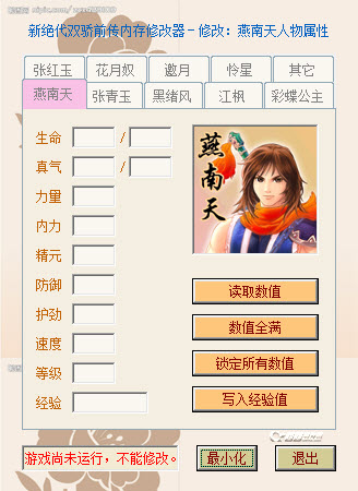 功能:修改人物燕南天,张青玉,黑绪风,江枫,彩蝶公主,张红玉,花月奴,邀月,怜心等人物的