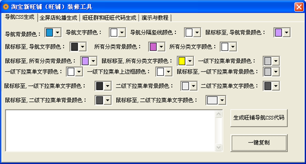 淘宝新旺铺装修工具支持导航CSS生成、全屏店轮播生成和旺旺群旺旺代码生成功能,软件内附演示教程,帮助你轻松装修新旺铺,赶紧下载体验吧。