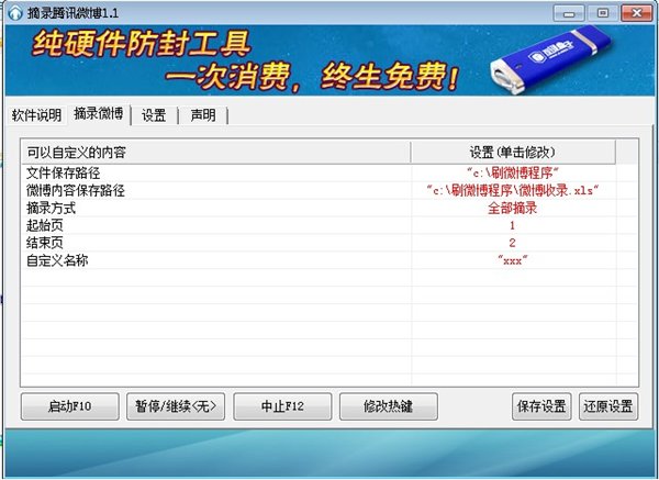 2.然后登陆腾讯微博,到任意一处需要摘录微博信息的地方启动脚本即可自动摘录,摘录的结果默认存储在C:\刷微博程序\微博收录.xls文件里。图片存储在C:\刷微博程序\微博文件