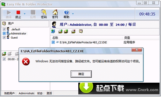 Easy File Folder Protector V4.83 绿色汉化版 Easy File Protector 是一个密码保护安全工具,防止别人未经你的许可操作你的文件。你可以选择用户,设定文件/目录及时间段,激活程序。此后,你的系统自动根据当前用户和时间段来取消/激活设置的文件和目录。对文件/目录的保护方式有:禁止删除,禁止改名,禁止读取,禁止修改,禁止执行。你也可以利用通配符来保护有相同扩展名的文件。