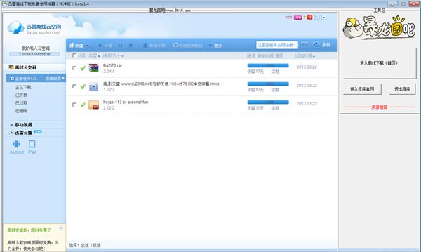 迅雷离线下载免费使用神器由暴龙图吧制作,是一款可以免费无限制使用迅雷离线下载的实用工具。设有100万GB的离线空间,让你免费无限制使用。你只需要把需要下载的资源添加到离线下载任务中,就可以关机去做其他事了,过一段时间之后你再开机从迅雷的专用服务器上高速copy这个资源就可以了。相比常规的下载方式,离线下载省时省电。