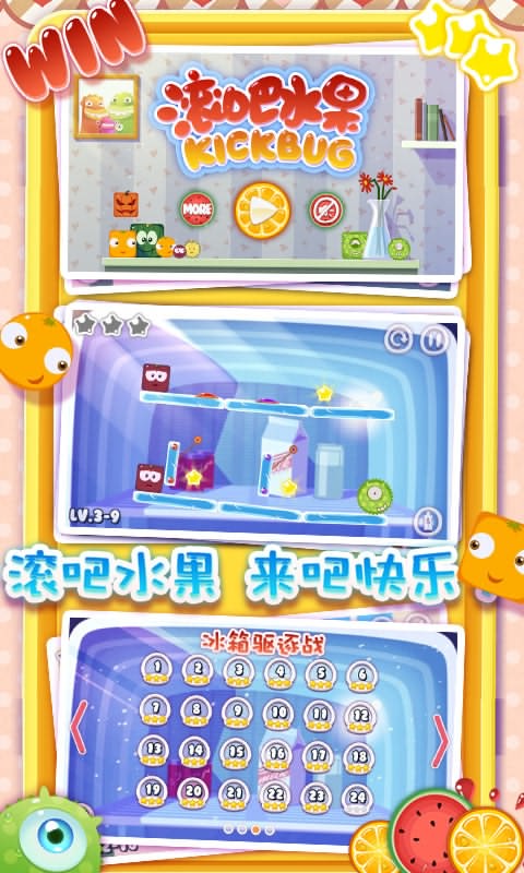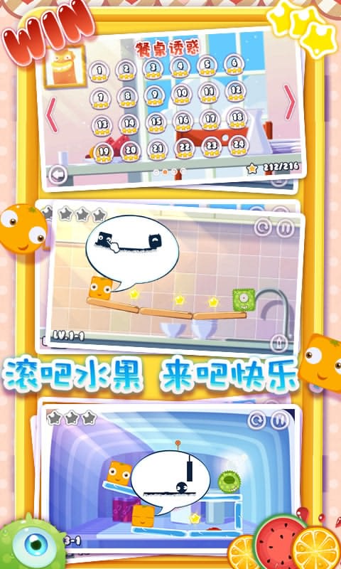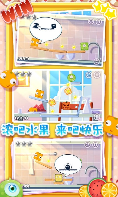 这款游戏最大优点还在于关卡丰富多变,绝对满足您不断挑战的欲望和需求,4个主题鲜明的世界各自搭配24个设计精巧的关卡,共有96个花样不同的关卡在等着你。不同世界将给与你不同的体验,随着关卡的升级,场景元素还会发生变化,“传送门”、“机关”、“冰层”等等逐渐加入,甚至水果也会有新花样,水果们并不是都只会滚的哦!能飘起来的,能弹开其他水果的,期待吧?动心吧?那就赶快来试试吧!
