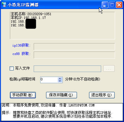 小编使用的是长城宽带,由于长宽经常性的更换IP,所以需要去查找自己的真实IP,小恐龙IP检测器能够让你实时获取IP138的数据,可以配合快盘或者dropbox使用,快速获取远程主机IP地址,便于动态IP用户远程桌面操作。