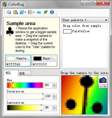 1.开启 ColorBug 后,将相机图式,使用滑鼠拖曳到萤幕要取色的位置来拍照,[+][-]可用来放大/缩小所拍照的相片,接下来便可用滴管来取色。