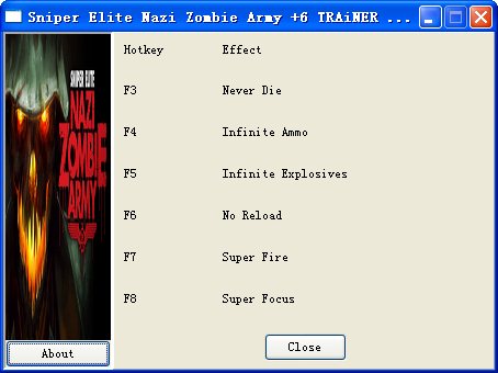 使用说明: F3 - 无限生命 F4 - 无限弹药 F5 - 无限炸药 F6 - 无需装弹 F7 - 速射 F8 - 超级精准