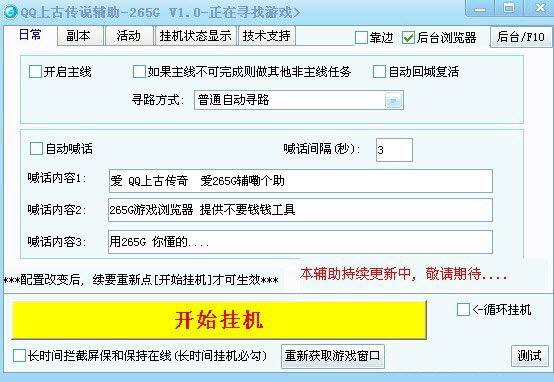265G上古传说辅助完全模拟按键操作,不修改任何游戏数据和封包,上古传说是一款大型即时制RPG纯武侠类角色扮演网页游戏,整款游戏具有中国传统文化的中国古代神话背景和精美写实的场景,体验游戏历史情节,让你尽情享受穿越所带来的刺激体验和快乐。