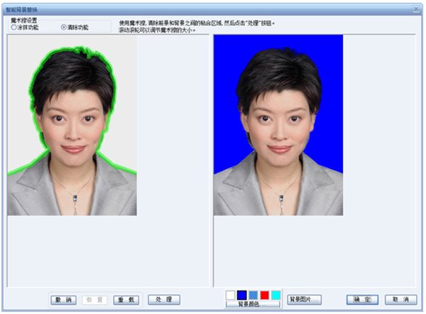 4.替换背景。点击“背景处理”,利用对话框中的涂抹功能和清除功能,替换背景颜色或者背景图片。