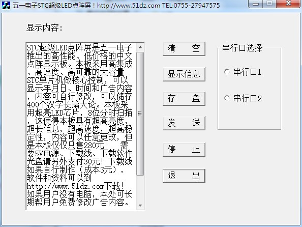 STC超级LED点阵屏是五一电子推出的高性能、低价格的中文点阵显示板。本板采用高集成、高速度、高可靠的大容量STC单片机做核心控制,可以显示年月日、时间和广告内容,内容可自行修改,可以储存400个汉字长篇大论。本板采用超亮LED芯片,8位分时扫描,这使得本板具有超高亮度,超长信息,超高速度,超高稳定性,内容可以任意更改。