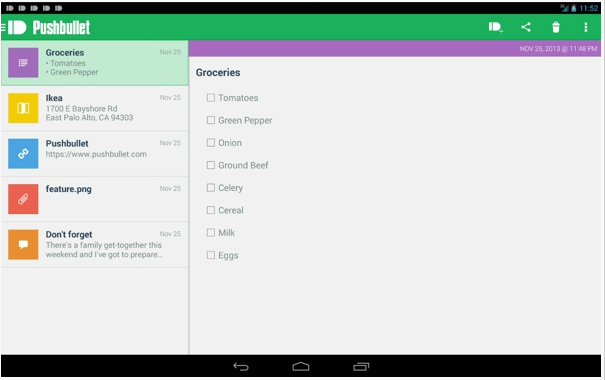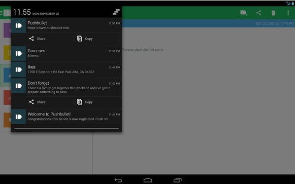 PushBullet 专注推送通知,只需要下拉一下通知栏,就可以看到文字,或者再一单击,网页或文件就会立即打开,甚至如果发送的是地址,单击就会进入 Google Maps 的导航。清除通知后,相关项目依然会归档到手机软件端。PushBullet 采用的是 Gmail 账户,绝对是各位 Gmail 用户的福音。