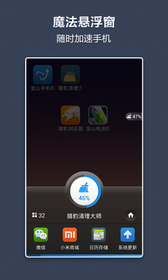 猎豹清理大师拥有最强劲的一键提速功能,可随时清理后台偷偷运行的进程,释放内存,提高手机运行速度,让手机远离卡顿。