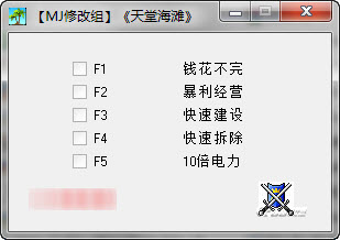 天堂海滩汉化版修改器,同名游戏的辅助工具和作弊器 功能:F1 钱花不完 F2 暴利经营 F3 快速建设 F4 快速拆除 F5 10倍电力
