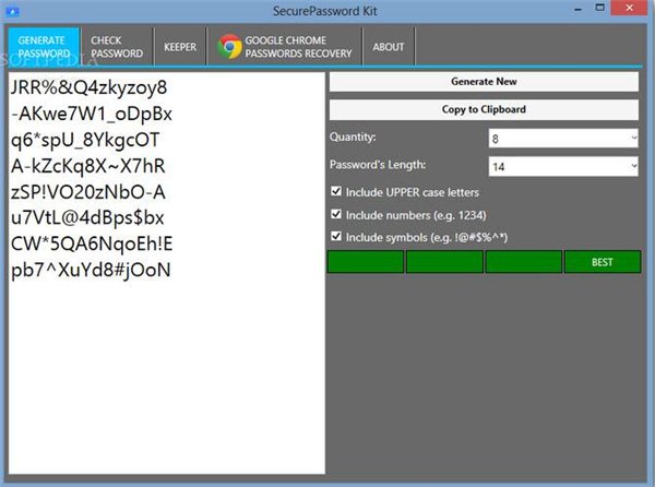 SecurePassword套件是一个用户友好的应用程序,使用户能够产生强大的密码可以保护他们的在线隐私。 SecurePassword工具包还提供了一个有效的工具,它存储为您的网上帐户的密码。此外,还可以依靠这个软件解决方案中获取存储在谷歌浏览器里的密码。