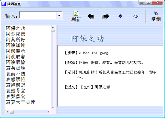 《成语速查3.6》修正了几个BUG,目前收录成语6500条。成语速查是一套成语查询与学习兼顾的共享软件,她为您提供强大的成语智能模糊查询、复制、管理、打印、学习和保存等功能,可自定义字体大小和颜色,保护您的视力。简洁友好的界面设计。每条成语注有拼音、解释、近义词、反义词、出处、举例、历史故事等,是您查询和学习成语的有力助手。2.收录的成语科学实用。如果用户确定注册(15元/套),今后将免费升级到更高的版本。如果成语掌握到一定程度并善于运用它,您的语言将更加精炼优美,出口成章,您的文章将更丰有文采