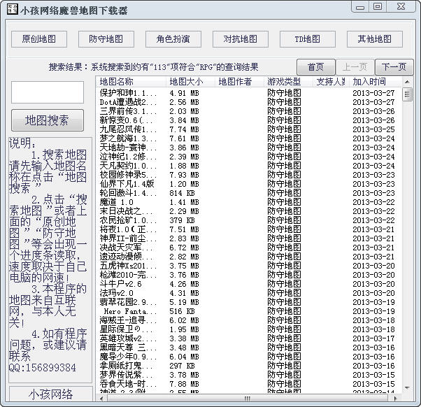 小孩网络魔兽地图下载器 1.0 绿色版 魔兽地图下载工具,可以下载到最新的魔兽地图,右键点击地图名称可以查看地图简介。