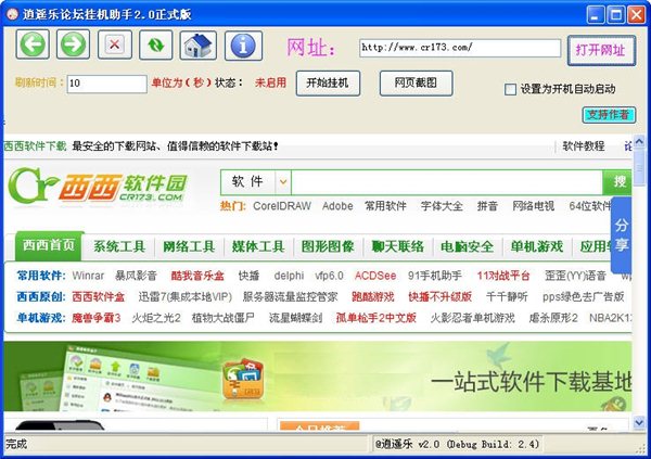 逍遥乐论坛挂机助手 v2.0 绿色版 逍遥乐论坛挂机助手是一款论坛挂机工具,为了方便广大网友挂论坛麻烦的问题,可以让它自动刷新网页,已达到挂论坛的目的。