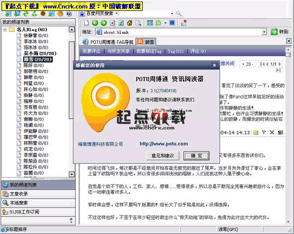 周博通是目前最流行的免费RSS阅读器之一,界面友好,分类清晰,操作简单.内置新浪网、新华网、天极网、计世网等数百个RSS新闻源,不用打开网页就可第一时间阅读自己喜欢的新闻,除拥有一般RSS阅读器的功能外,还有以下几方面特点: