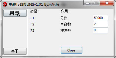 重装兵器修改器,对应同名游戏重装兵器1.01版本的辅助工具 功能: F1 分数50000无限 F2 生命数 F3 核弹数量