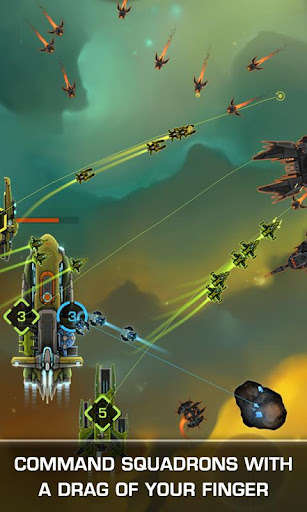 操作方面很简单,选中并拖拽要出击的舰队至敌人位置,舰队上的飞船就会沿着所画路线来回飞行并对范围内的敌人进行攻击。战舰上的数字代表携带飞船的数量,飞船被击毁时,可以随着时间重生。由于敌人的攻击方向各异,因此你需要根据战局的变化不断地移动你的飞船,这种操作方式很像即时战略的模式,而实际游戏中你也会找到玩星际的感觉。
