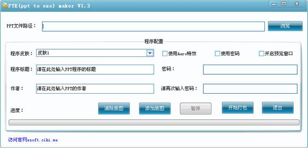 将ppt打包成exe文件_PTE(ppt to exe)maker是一款可以将ppt打包成exe可执行文件的工具 1.生成的文件体积小于打包之前的文件体积 2.生成的文件只有一个exe文件,而不再是一个文件夹 3.若在程序配置界面输入密码,则生成的文件在运行时需要输入密码 4.生成的文件在运行时直接进入放映,无法进行编辑 5.生成的文件内置了放映功能,即使在没有安装powerpoint的电脑上也不用担心无法运行 6.包含33款皮肤,Aero特效 7.界面预览功能,可以提前预览界面 8.生成的文件可以自定义标题和作者 9.本软件的下载及使用是完全免费的 10.本软件可以在windowsXP/windows vista/windows7/windows8下完美运行 11.底图功能,制定界面更加自由