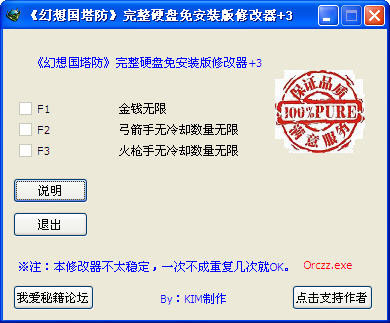 幻想国塔防三项修改,幻想国塔防是一款有趣的塔防游戏,这是一款为游戏制作的作弊器,一共三个选项,帮助菜鸟玩家通过难关。 使用说明: F1 金钱无限 F2 弓箭手无冷却数量无限 F3 火枪手无冷却数量无限