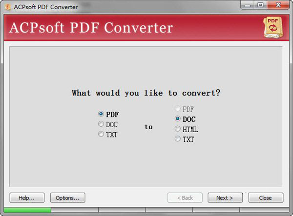 多功能PDF转换器(ACPsoft PDF Converter)是一款免费的多功能 PDF 转换器,可以将 PDF 转换为 DOC、HTML、TXT 等格式,还可以当作 Word to PDF 转换器使用,将 DOC 或 TXT 文件转换为 PDF 文件,但仅支持将英文文档转换为 PDF。
