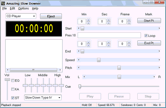 Amazing Slow Downer V3.1.8 英文绿色特别版 神奇变音器(Amazing Slow Downer)是专为玩音乐的人所设计的“混音播放工具”,它可以不用改变音调,直接将歌曲快转/慢转 50% 到 400%,音调也可以实时调整,支持CD光盘、MP3歌曲、WAVE文件的播放。 用它来做效果,可以将你手中的音乐搞成时髦的俱乐部音乐,让你轻松成为打碟高手!