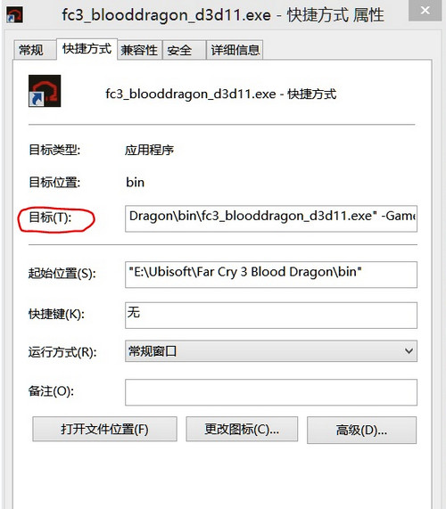 游戏快捷方式“fc3_blooddragon_d3d11.exe”属性 目标 exe后面点下空格添加: