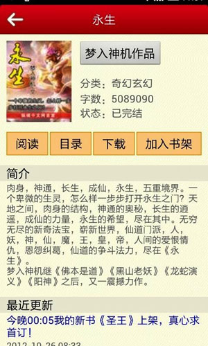 4、这时就跳转到了,这本小说的详情页面,在这个页面你可以缓存这本小说,也可以查看它的目录等,如图所示: