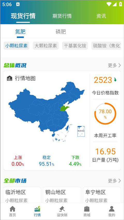 2. 点开现货行情页面,用户能够查看化肥整体概况、所有市场行情价格以及所有工厂行情。