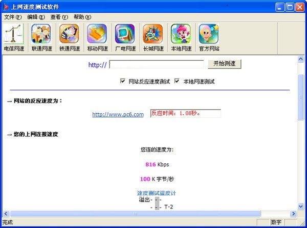 上网速度测试软件是一款国内最专业最权威的网速测试及网站速度检测软件。检测包括电信、网通、联通、移动、长城宽带、广电等线路,即时测试本地的网络速度,测试网站在全国各地和海外的打开速度。