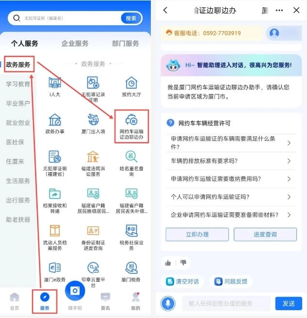 1. 登录“i厦门”平台,进入服务页面,点击【政务服务】-【网约车运输证边聊边办】选项就可以了。