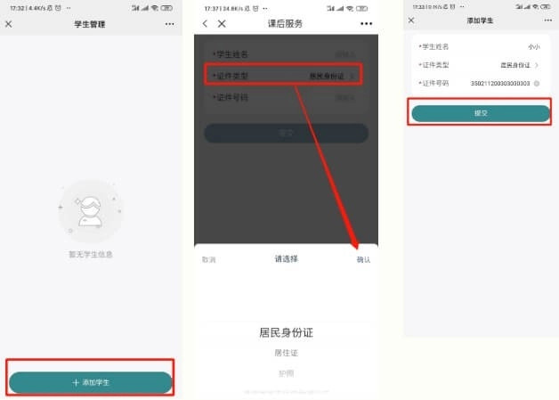 2.2 点击【添加学生】按钮,页面将跳转到学生信息填写页面。在此页面填写学生信息,选择【证件类型】,然后点击提交。若系统提示添加成功,即可进行报名操作。(若已存在该学生信息,则可跳过此步骤。)