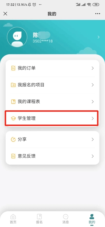 2.1 打开“课后服务”专题页面,轻点右下角【我的】-【学生管理】,随即进入学生管理页面。