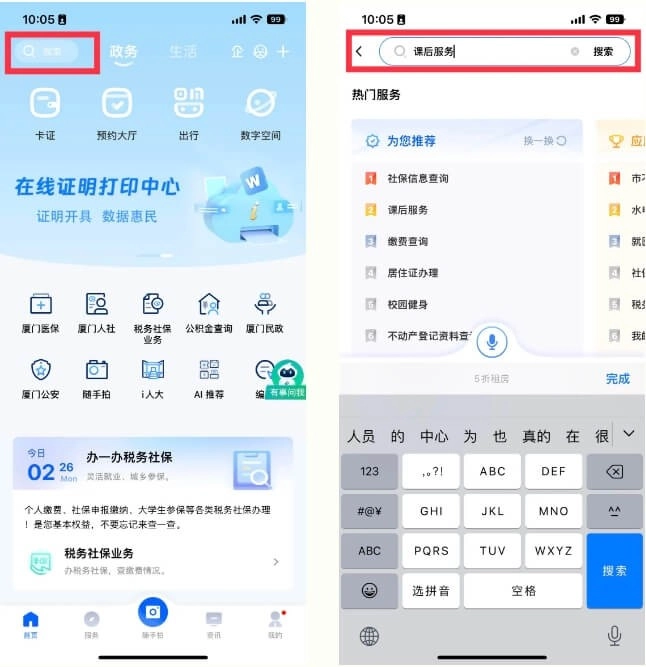 打开“i厦门”,在顶部搜索栏输入关键词“课后服务”,随后进入课后服务专题页面。