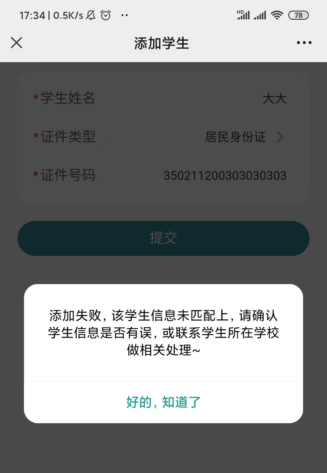 特殊情况一:要是出现添加失败的提示,需确认所填学生信息有无错误,也可联系学生所在学校进行处理。