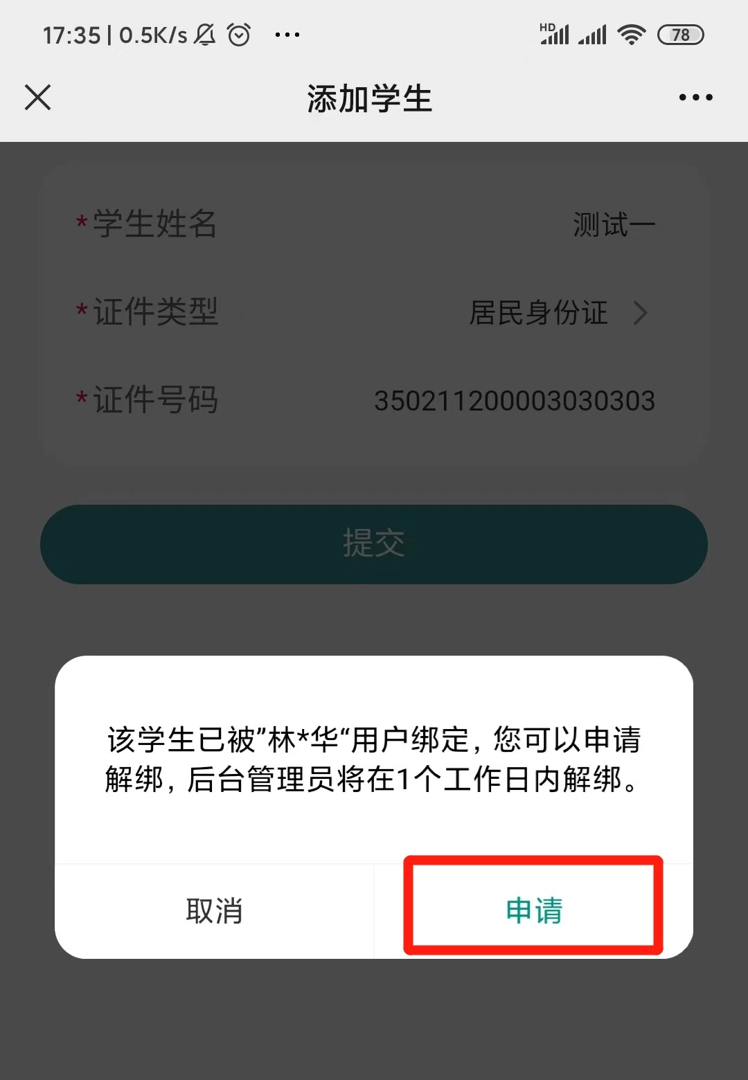 特殊情况2:若提示该学生已被绑定,点击【申请】进行解绑申请,后台管理员会在1个工作日内完成解绑操作,烦请耐心等待。