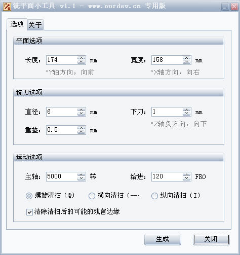 铣平面小工具专门用来生成铣平一个平面的G代码的小工具 使用:平面选项 铣刀选项 运动选项