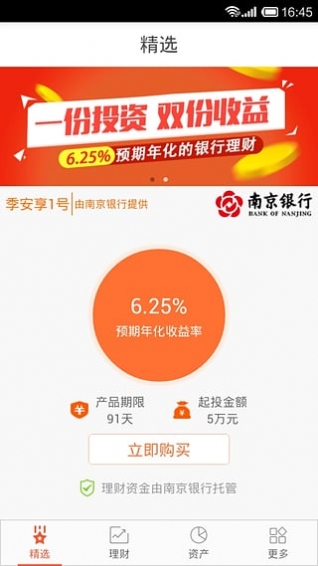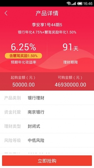 慧驾理财app南京银行电子银行旗下的一款为用户提供安全放心的理财产品和服务的手机理财应用。慧驾理财app主要依托于联创集团强大的技术研发实力以及“南京银行”、“君康人寿”等合作伙伴提供的优质金融产品及服务。【软件特点】