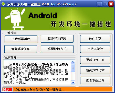 使用方法:先点下载所需组件,再点搭建开发环境,一切OK。搭建过程中会修改系统变量,安全软件会有提示,请予以放行。下载完成后,就可以搭建了,并可离线搭建。