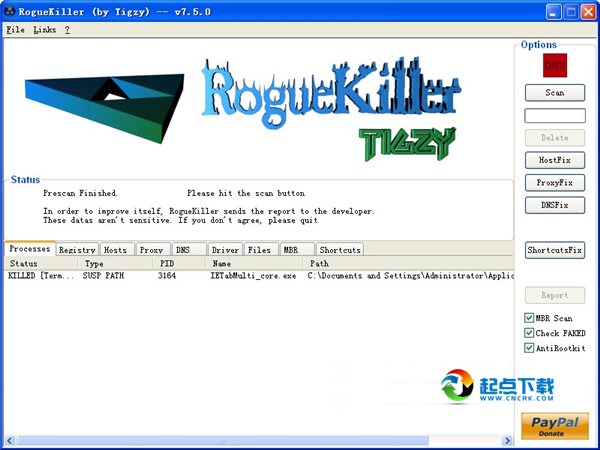 RogueKiller是一个写在C盘,其中扫描进程运行编写的工具,并杀死那些恶意程序。我开发后,看到一些流氓(如安全工具)堵塞了杀毒程序的执行,一些项目(如Rkill)出现在查杀流氓程序无效这个工具。所以我制定的执行,这是清理过程,并要求清理注册表,使之与通常的工具的杀毒,然后速度更快,更安全的工具。
