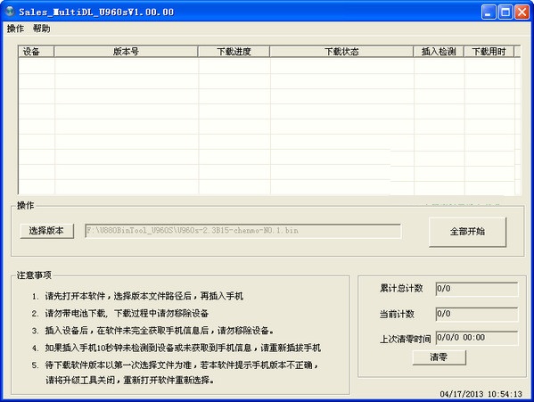 (6) 待下载的版本以第一次插入手机获取的信息为准。若本软件提示手机版本不正确,请关闭软件并重新打开软件以选择最适配的版本文件。