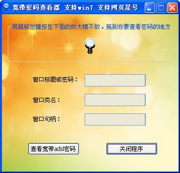 要查看宽带拨号密码,只要把放大镜拖拽到宽带密码框显示“[要更改保存的密码,请单击这里]”的地方,密码就会显示在软件主窗口了。其他星号密码查看方法也与此类似。要查看储存在路由器中的ADSL星号密码,请打开路由器的登录网页后,直接把放大镜拖到密码框,对于有子框架的网页,在子框架中点鼠标右键,查看并复制子框架中的真实网页路径后,把它粘贴到IE的地址栏,再次打开之后就可以用此工具查看其中的星号密码了。【更新日志】