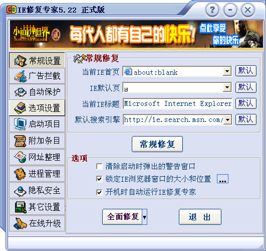 【1】修复功能:可修复IE标题栏、首页、右键菜单、工具栏按钮、工具栏菜单、附加工具栏(如百度搜霸、Google工具栏、搜狐工具栏等)、OutLook标题等;全面修复各项Internet选项,包括常规,安全,连接,内容,高级等所有选项设置;并提供"一键修复"功能,单击即可自动修复所有设置。