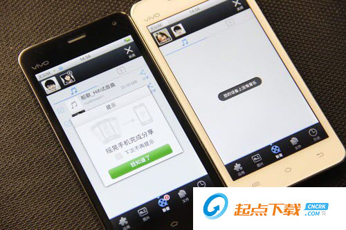 首先我们需要建立自己的头像和名称,以便在随后的文件传送中让朋友更好地找到你,我们分别将黑白两款vivo X1命名为小黑和小白,完成之后小黑会主动创建连接,这个时候vivo闪传将建立自己的无线热点,小白只要在“连接朋友”中搜索加入即可,这样一条由vivo闪传建立的爱情高速传送通道即可开启使用。在小黑和小白头像的旁边都会显示对方的头像,为了展开爱情攻势,小黑想珍藏在手机里一首好听的小情歌传给小白,打开位于下方的影音分类,点选之后轻轻摇一下手机,这首歌很快就出现在了小白的手机上,一首25M的歌曲仅需5秒钟即可完成,而且不会花费任何流量,可见速度之快。