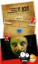 《吓人恶作剧Scare Prank》的恶搞原理其实与网上许多同类游戏差不多。那就是先用一些好玩的东西,或相当无害怕的图片来降低玩家的警惕性,然后提示你点击图片中的某个位置,紧接着……惨剧就发生了。不是画面上出现血淋淋的女鬼头,就是肠子肚子掉一地的恶心僵尸,而且还伴随着最高音量的尖叫和震动效果。别以为关了声音就没事,它会自动将音量调至最大,我的神啊,饶了我吧!